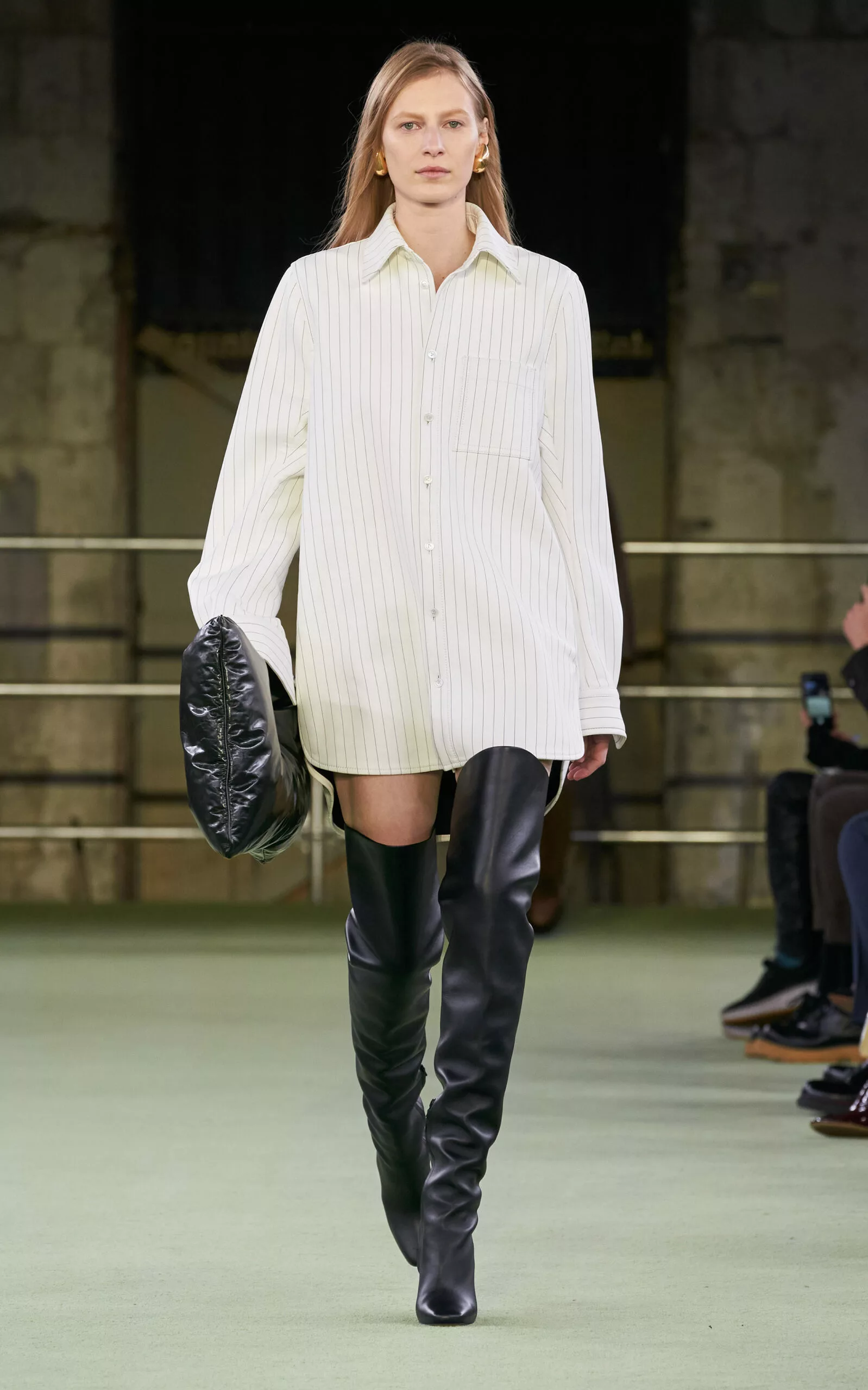 - Over-the-knee boot silhouette, calf leather body, pointed toe, tapered heel