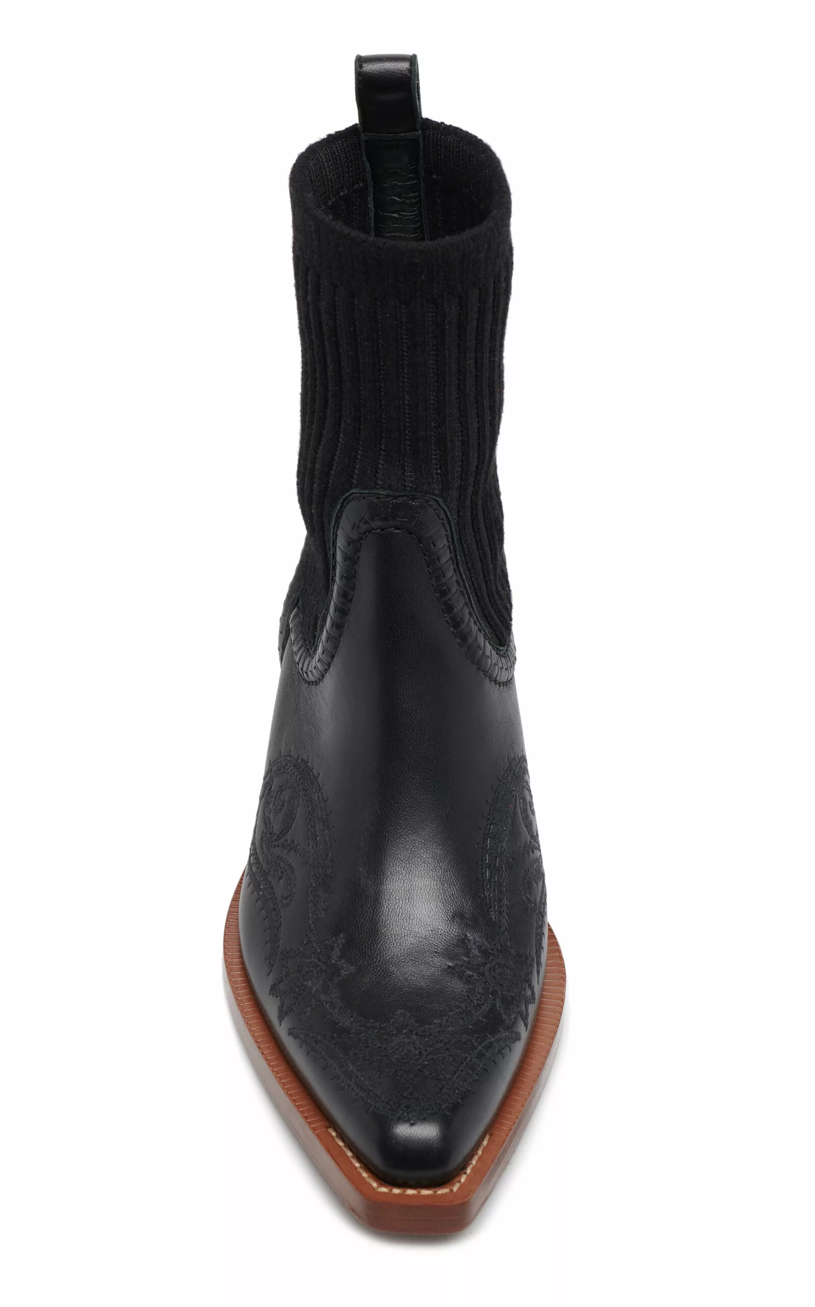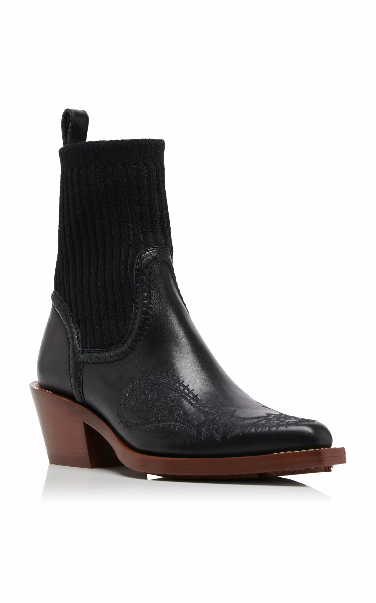 Inspired by Western styles, the ‘Nellie’ boots are constructed from low-impact leather with whip-stitching around the vamp and heel — a house signature. The knit ankle gives them a snug fit.