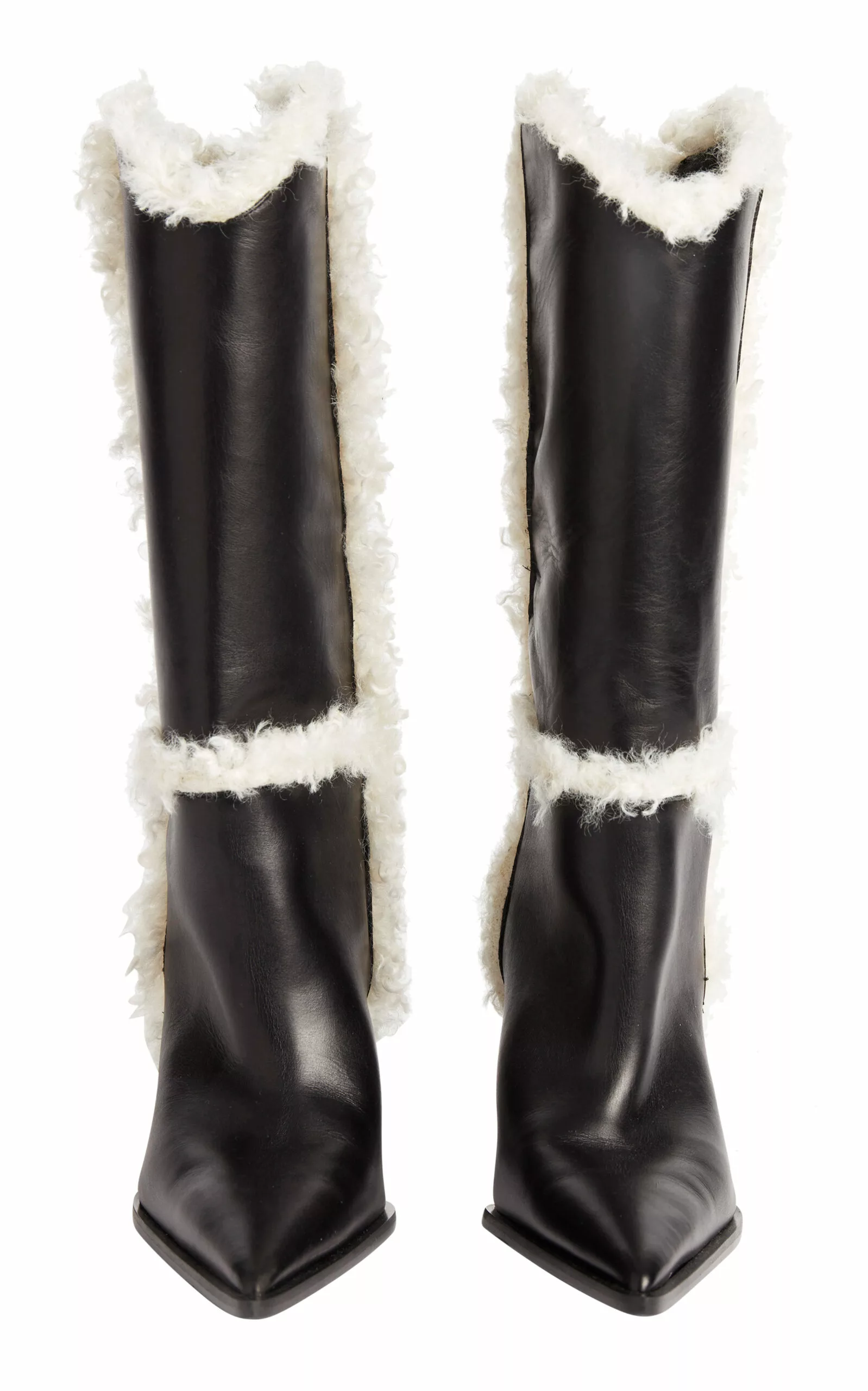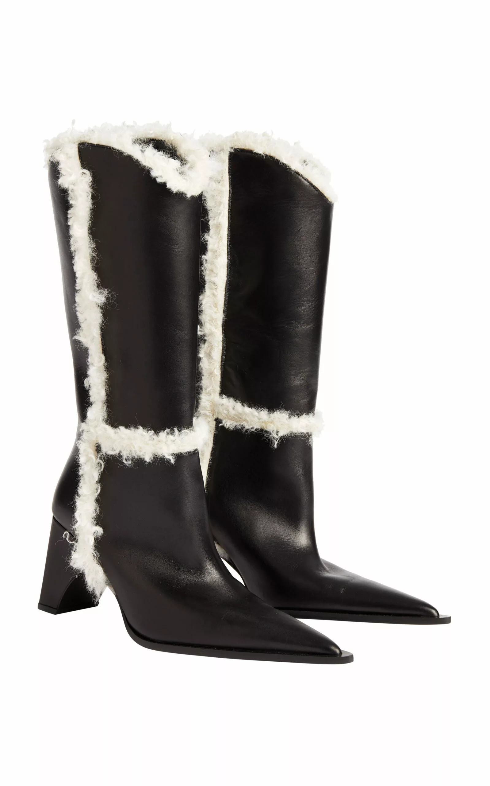 - Knee-high cowboy boot silhouette, leather body with shearling detailing, pointed toe, sculptural block heel
