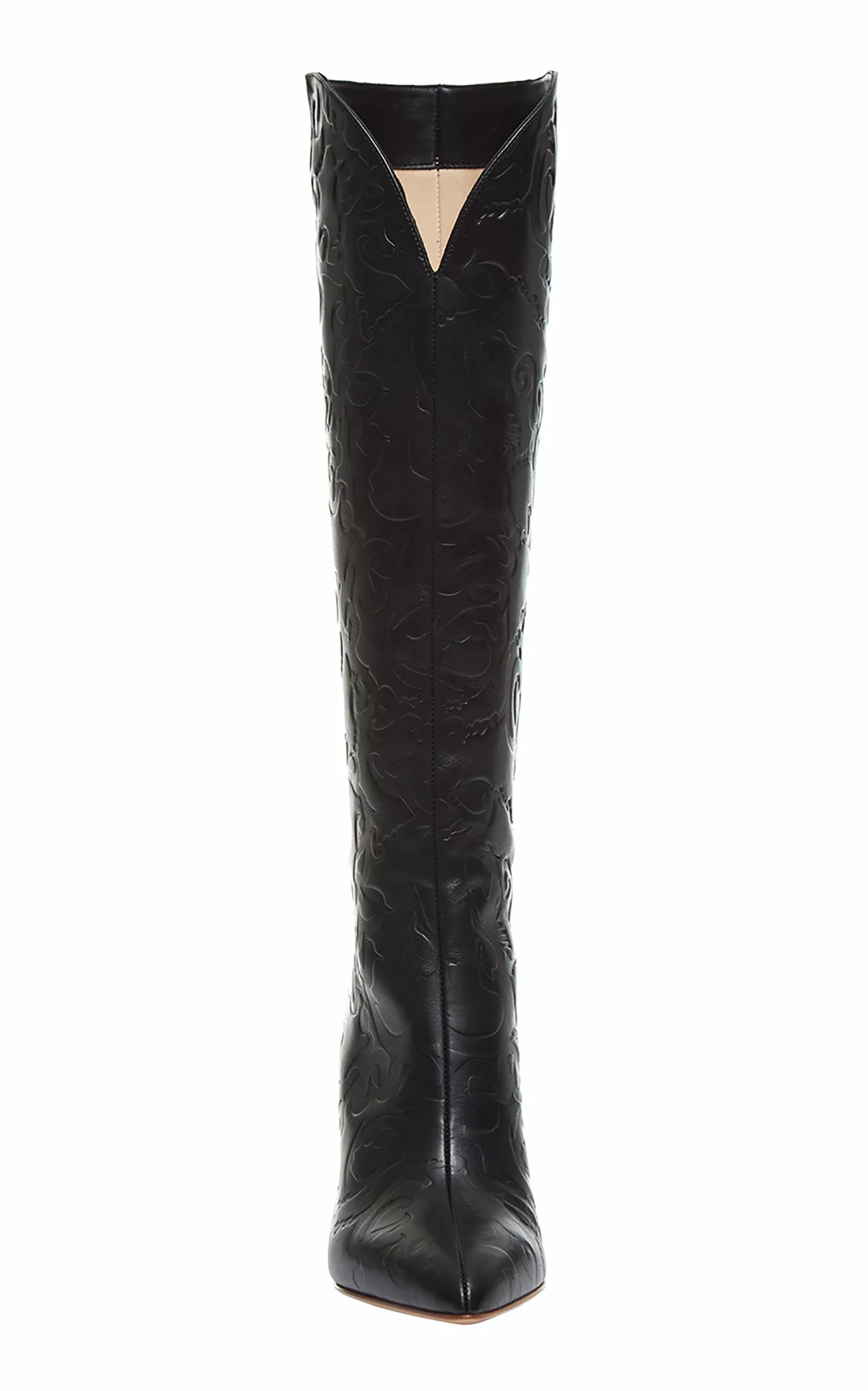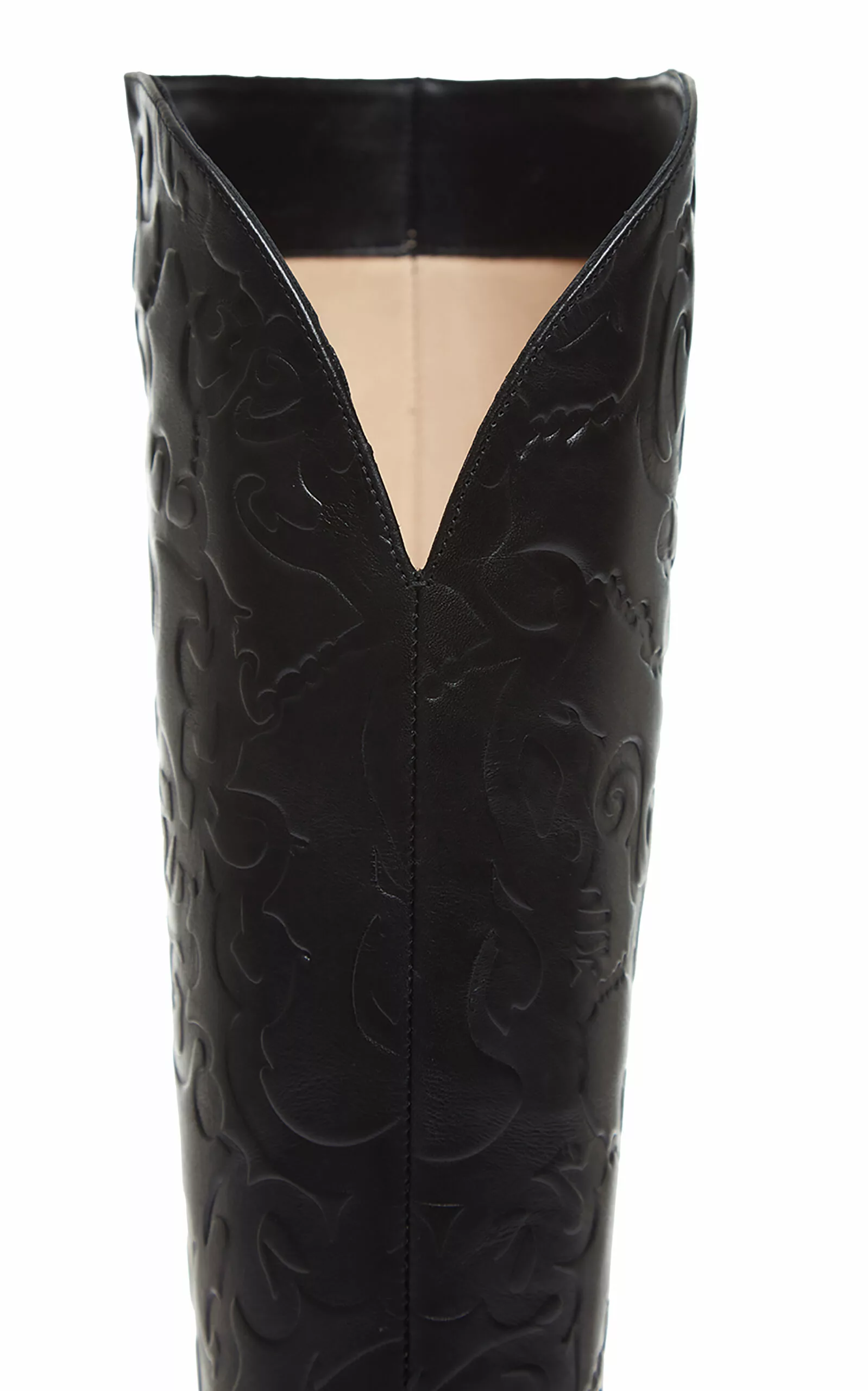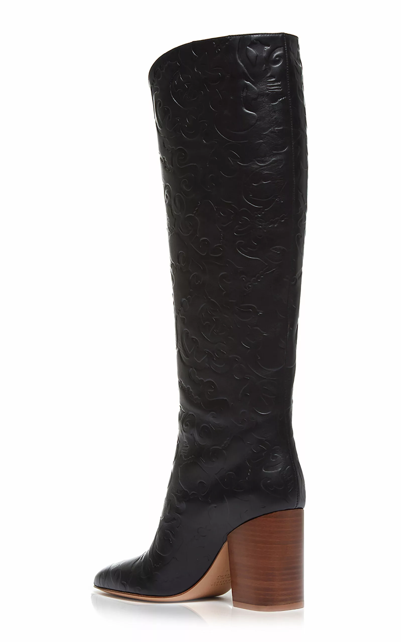 - Knee high boot silhouette, leather body and sole, wood block heel, pointed toe
