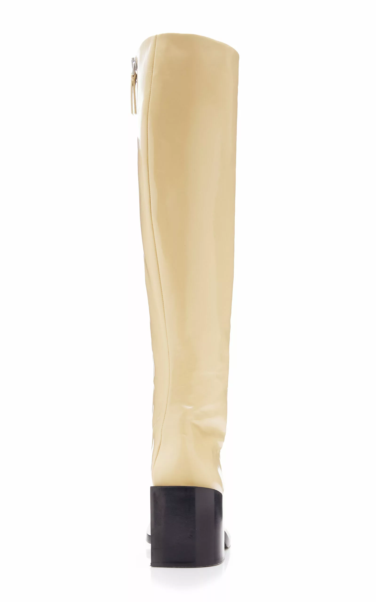 Cast in point, the ‘Abrasivato’ boots have a knee-high silhouette made from glossy spazzolato leather with rounded toes that point sharply towards each other. The oversized block heels make them endlessly comfortable — and chic.