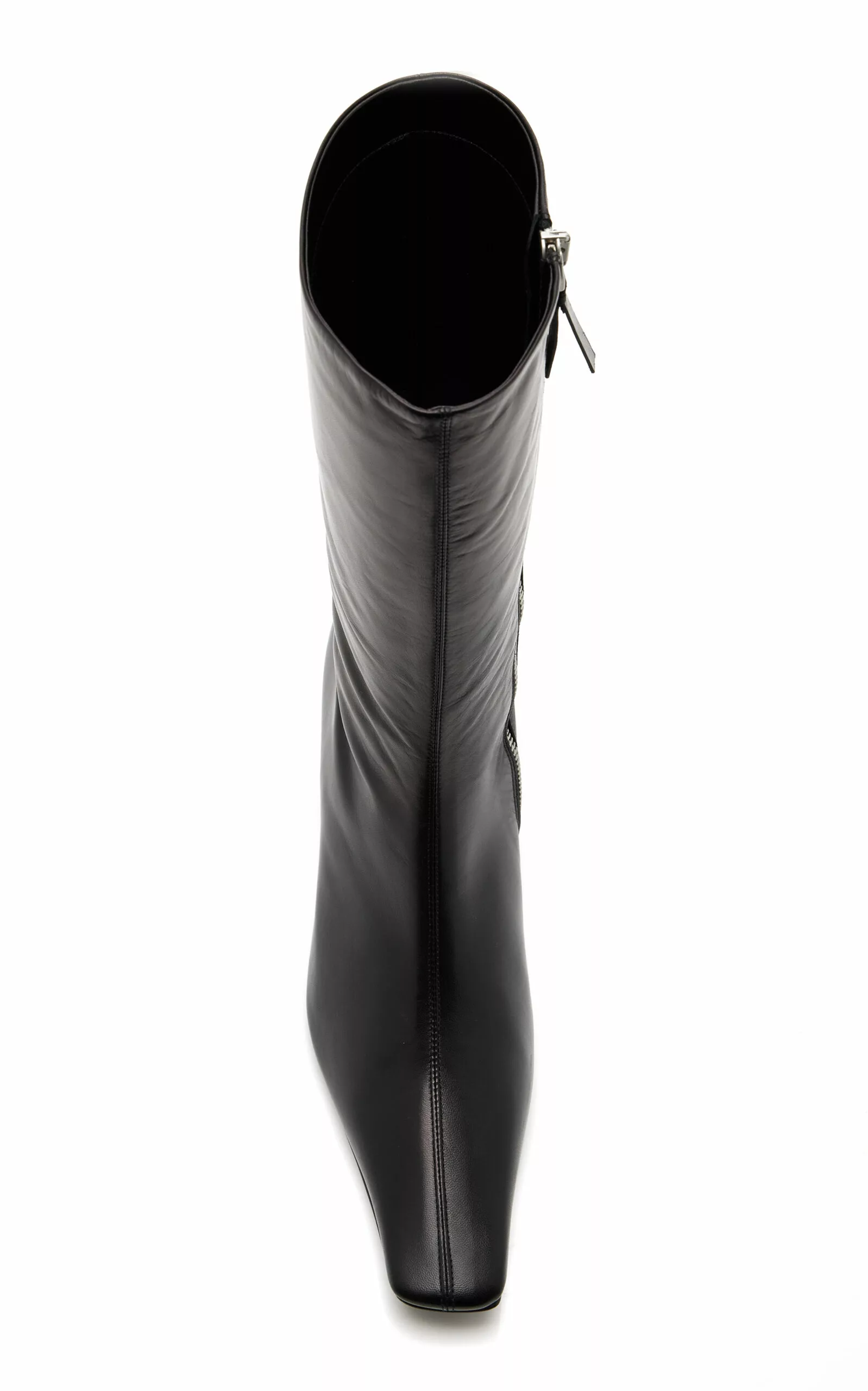 These ankle boots have a foot-hugging design made from smooth goatskin with elongated square toes that lengthen your frame. The midi heel makes them comfortable enough for all day wear.