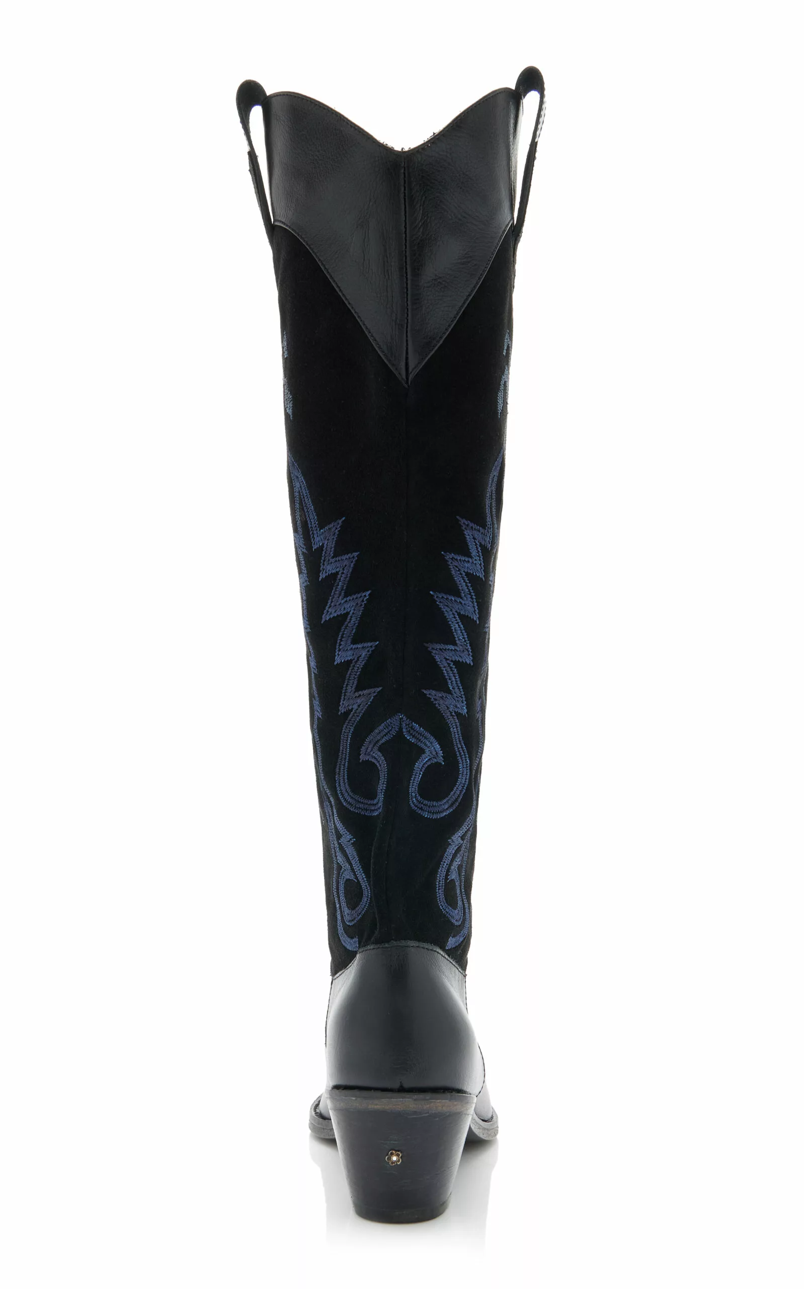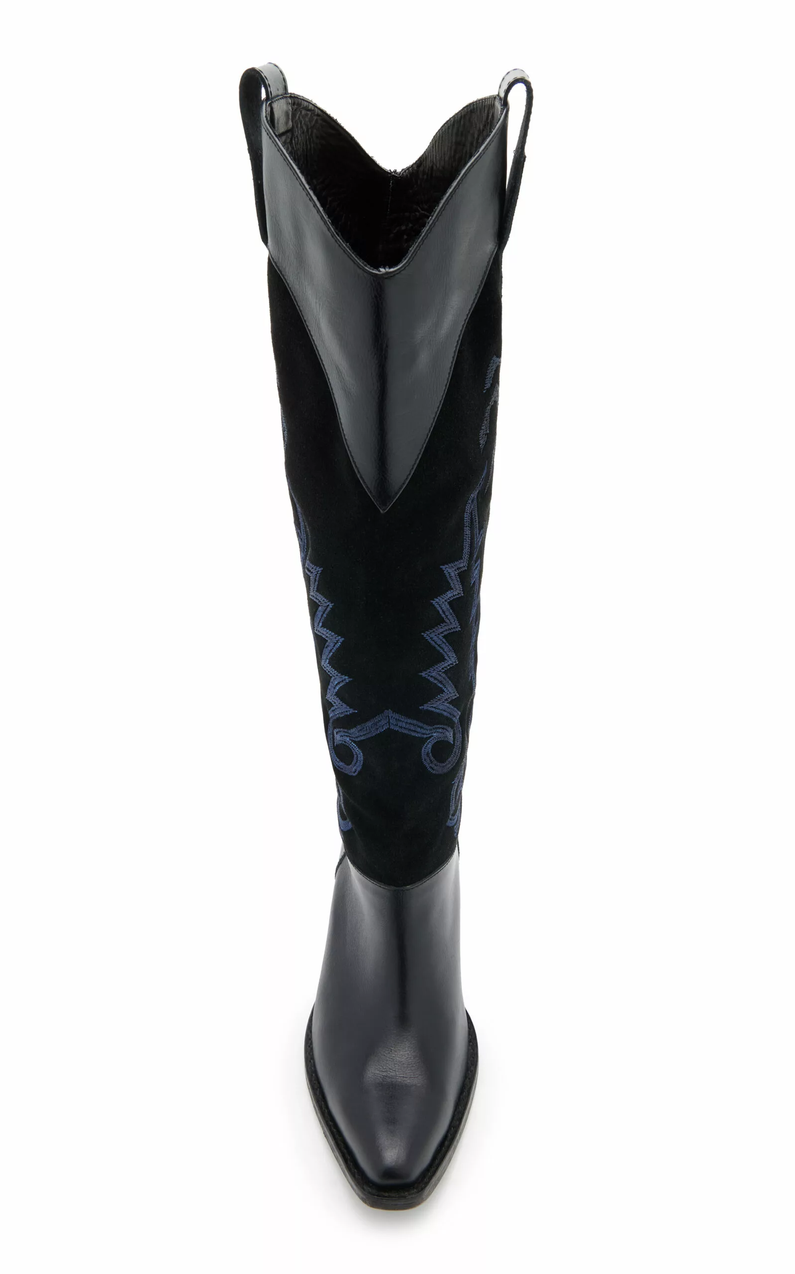 The ‘Edge Of The World’ boots have a knee-high silhouette made from cowhide leather embroidered with a Western motif. Wear them with the designer’s flowing maxis.