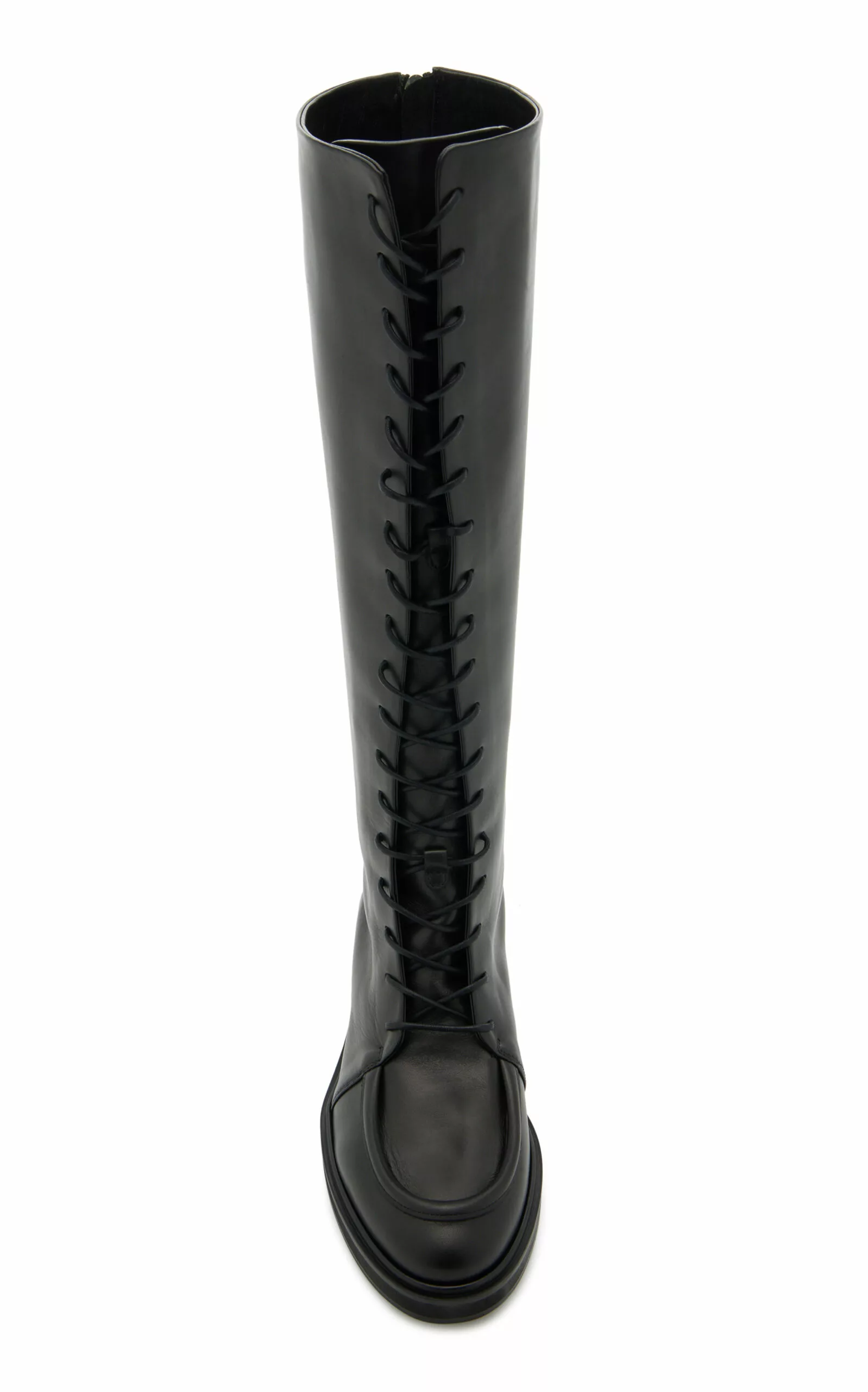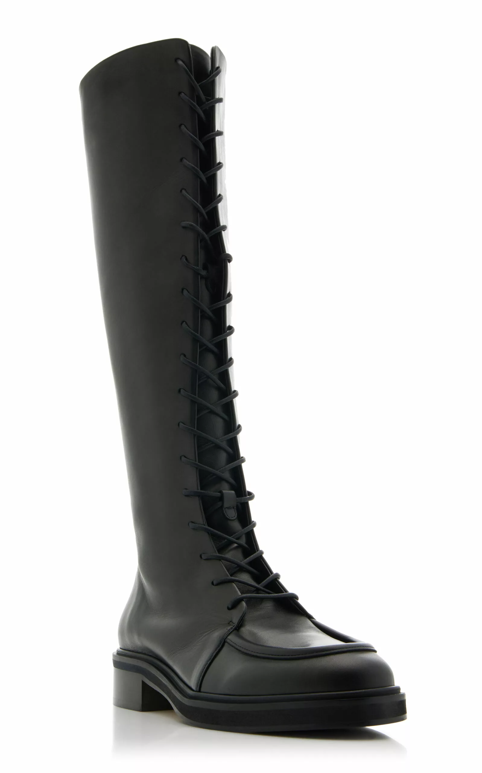 The ‘Mathilde’ leather knee boots have a combat silhouette with piping along the vamp to give them a polished feel. The back zipper makes it so you can keep slip them on and off with ease (and keep the laces pristine).