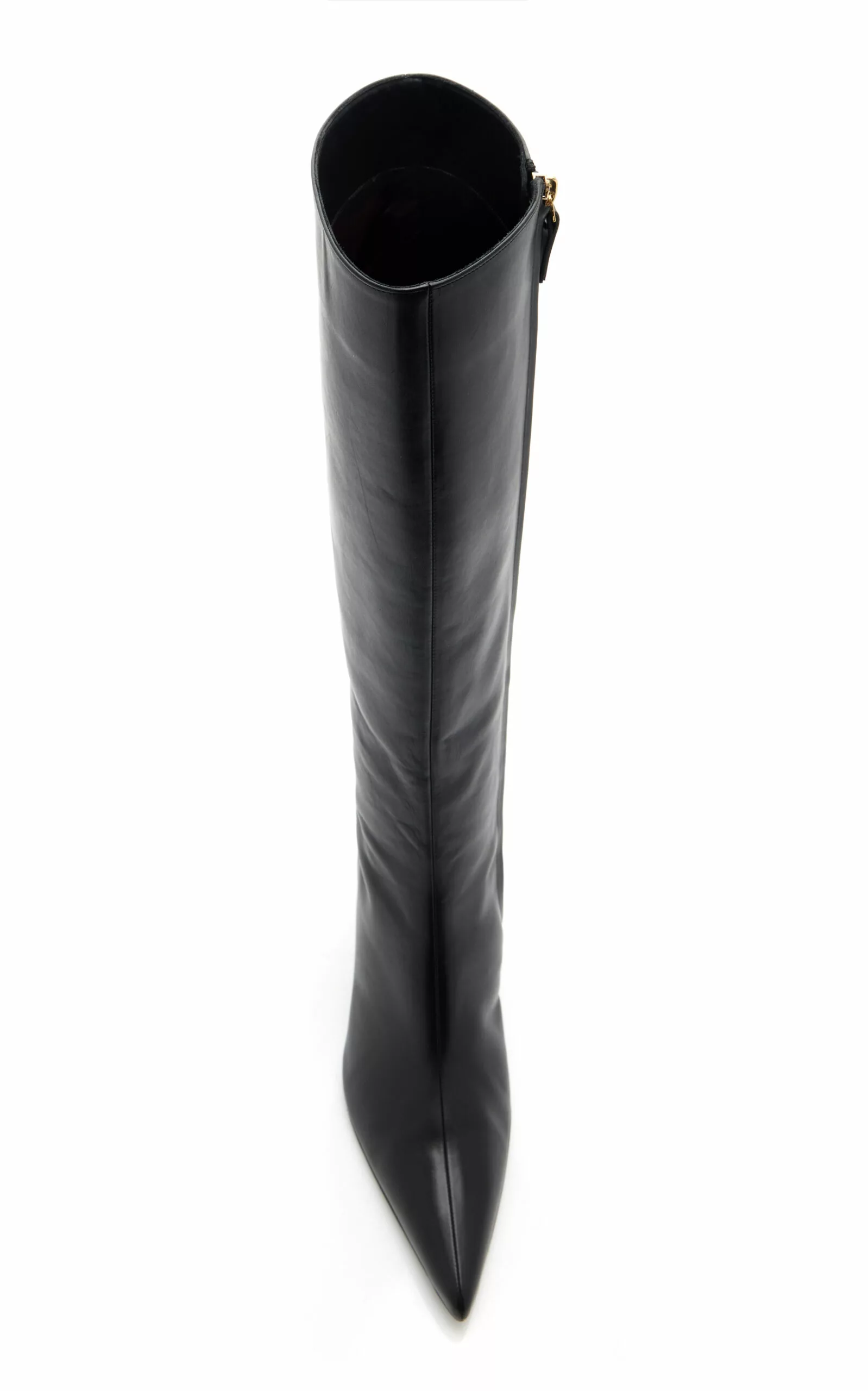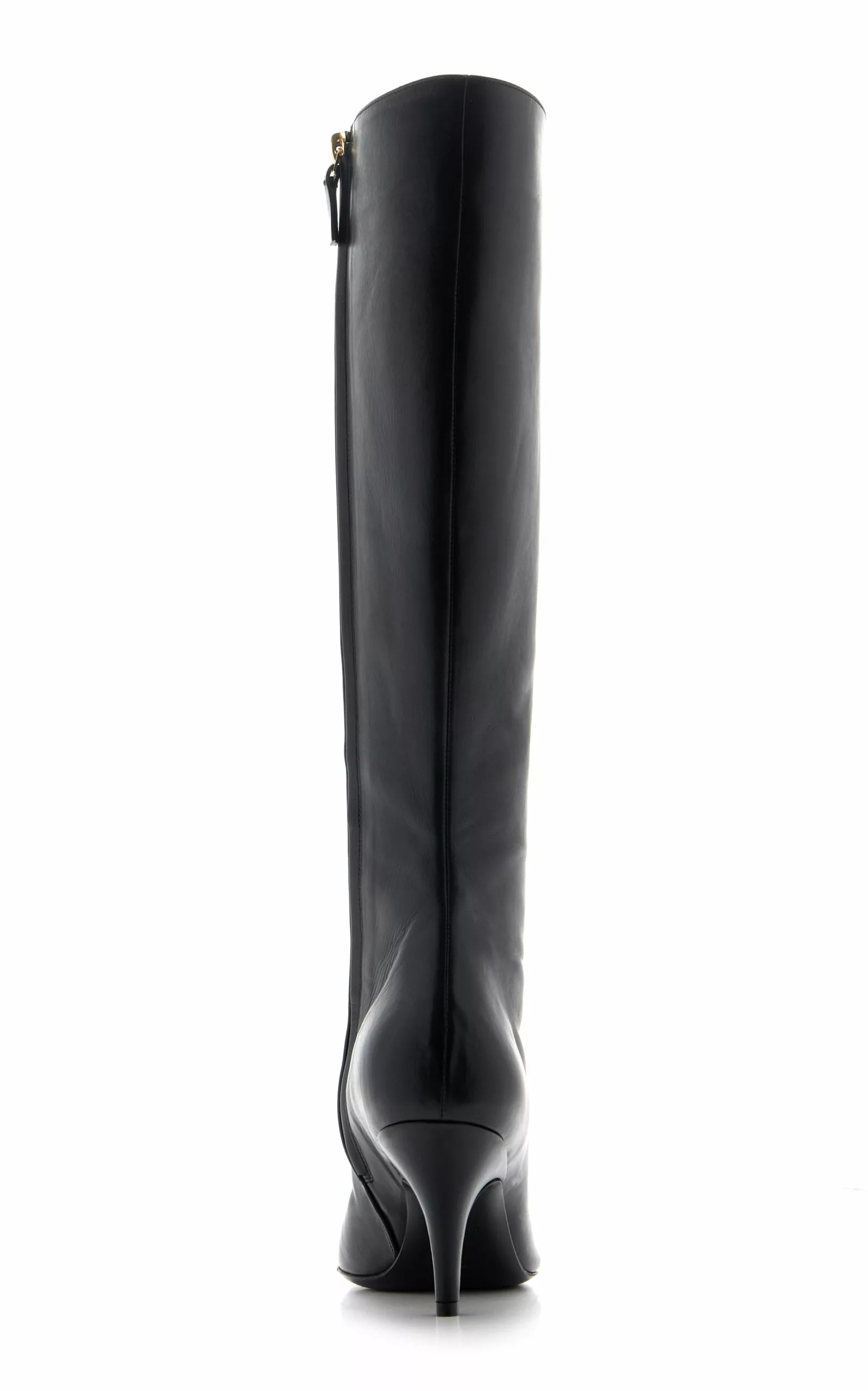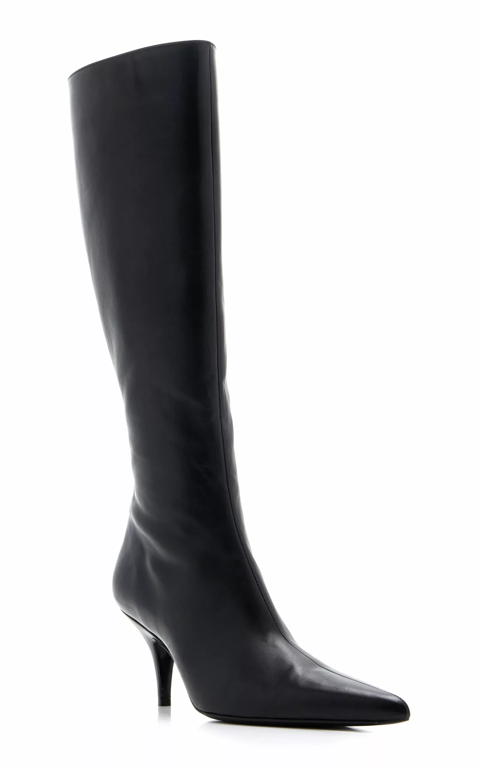 Crafted from lightweight calfskin, the ‘Sling’ boots have a fitted knee-length silhouette with elongated point toes and a midi heel. Wear yours with the label’s faultless tailoring and effortless eveningwear.