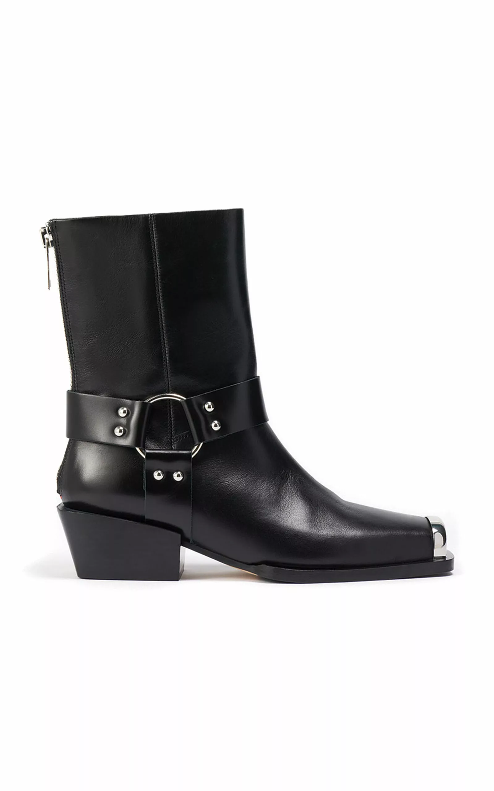 The ‘Wayne’ boots are made from grained leather with silver-plated toes and O-ring harness hardware. An elevated staple to pair with midi hemlines and wide-leg silhouettes.