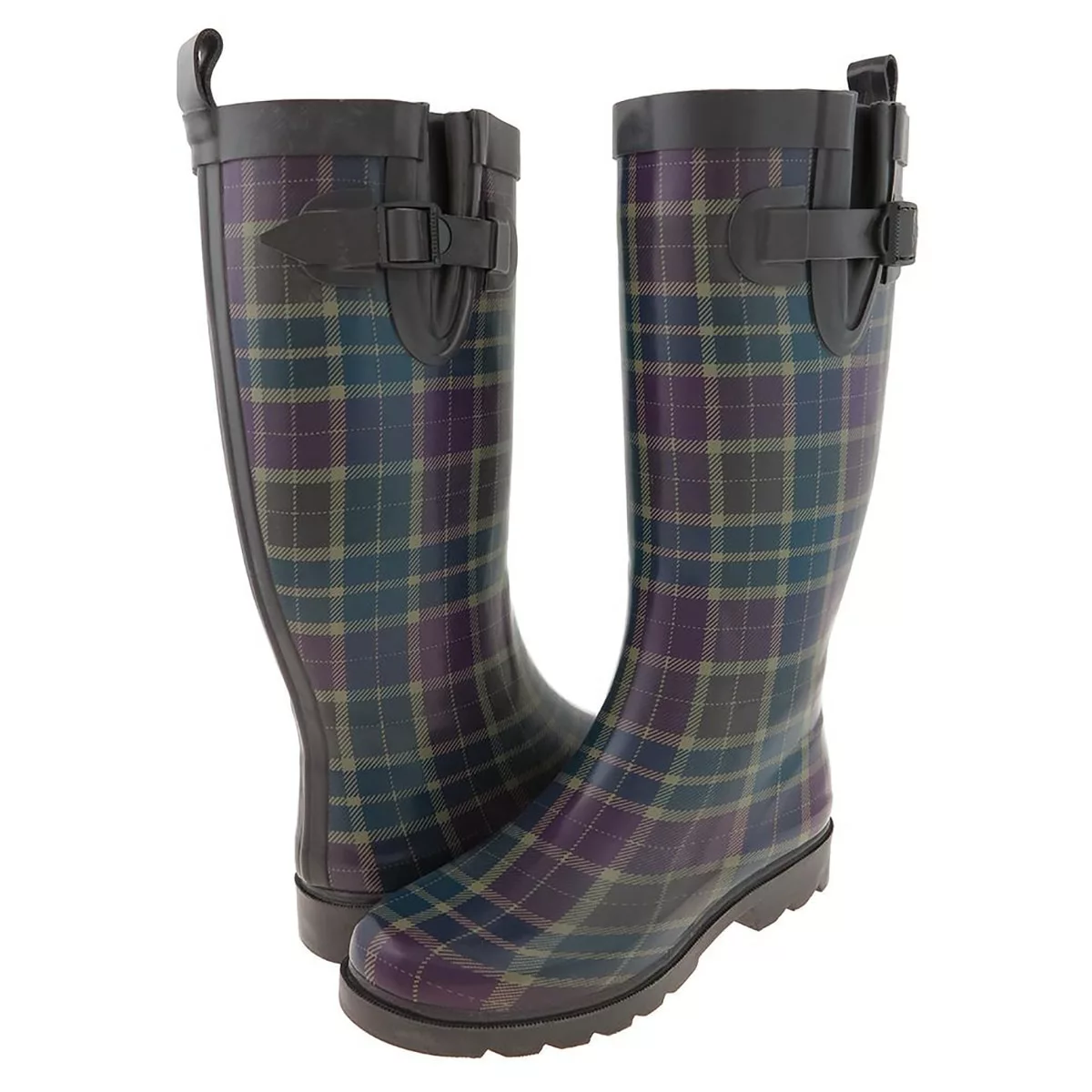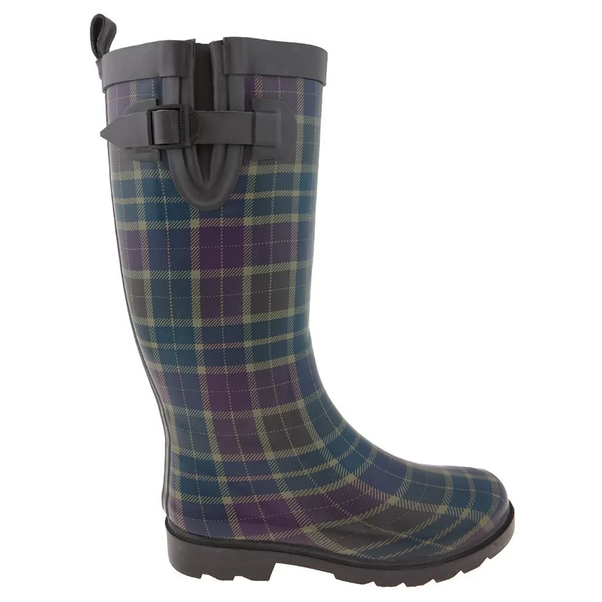 Dodge droplets with the Womens Capelli New York shiny blanket plaid tall rubber rain boots with adjustable buckle detail at the side and back tab for easy pull-on.