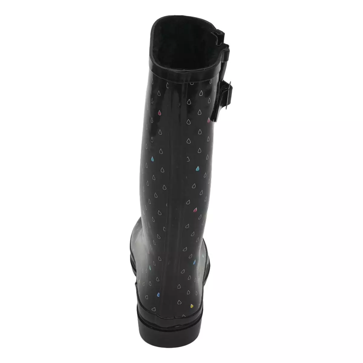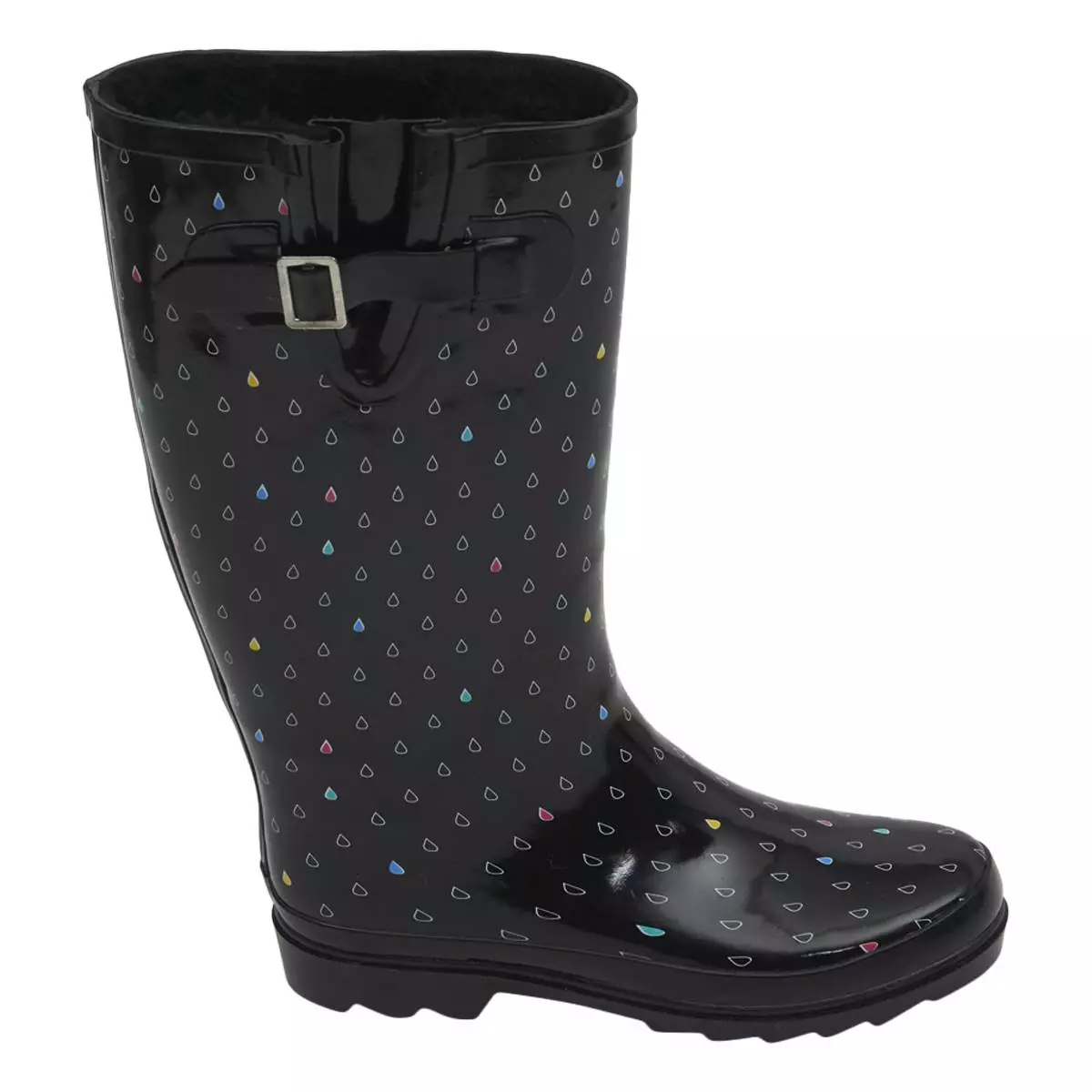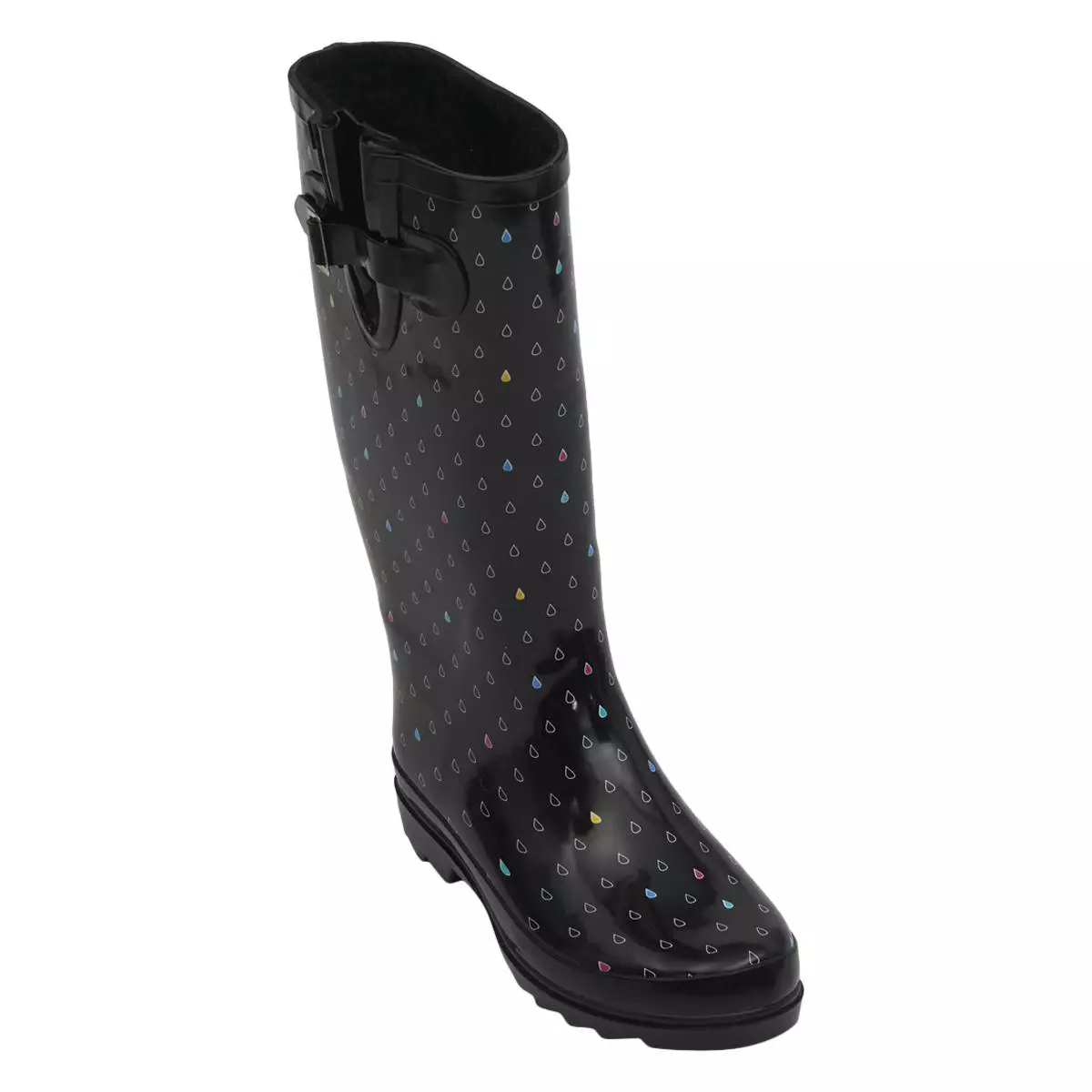 With cute raindrop print, the Womens Fifth & Luxe tall rain boots with decorative buckle and faux fur lining keep feet looking cute while staying dry.