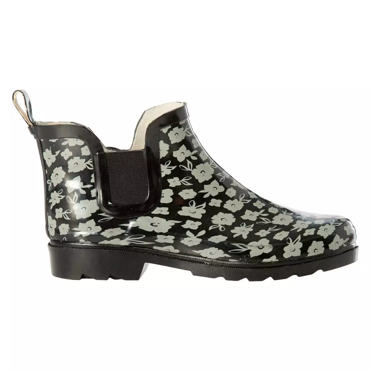 Stay dry and stylish in these Womens Laila Rowe shiny flowers rain boots. These rain ankle boots include a back pull loop and elastic side gores for easy on/off.